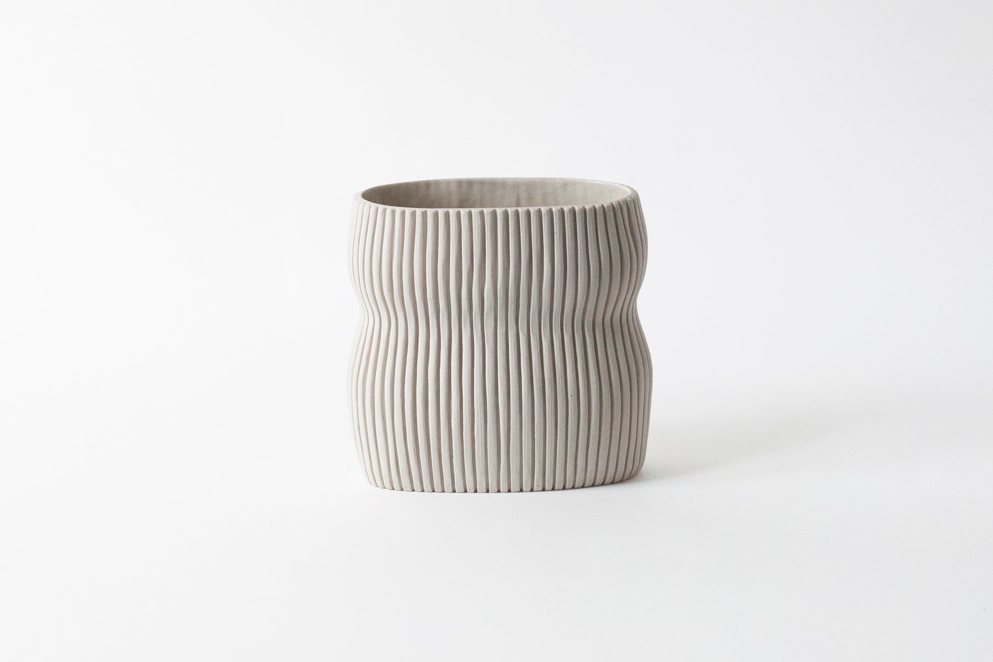 Unglazed porcelain exterior with clear glazed interior. The Oval Curvy 2.0 Collection offers thicker ribbing with more wabi-sabi.