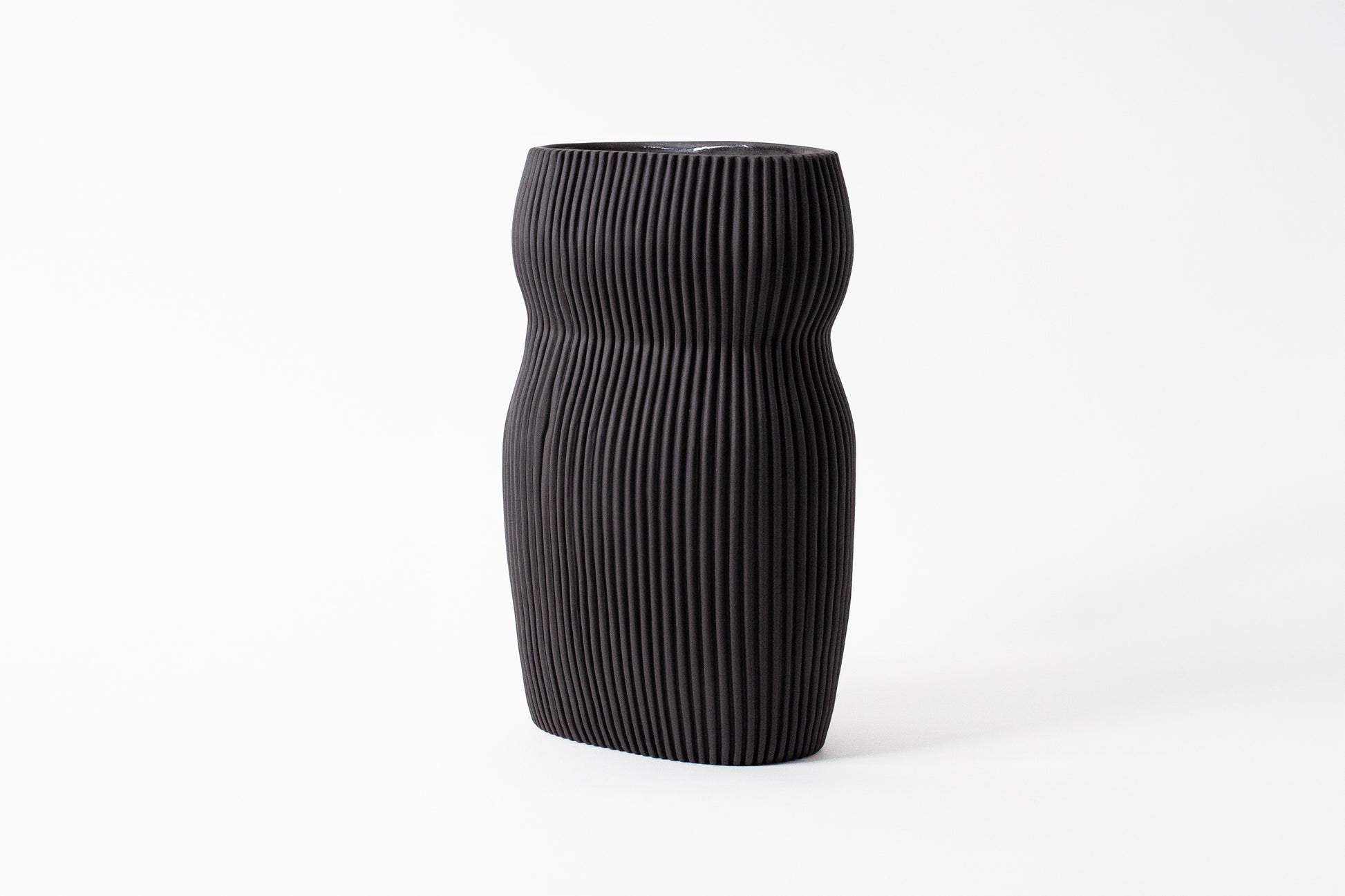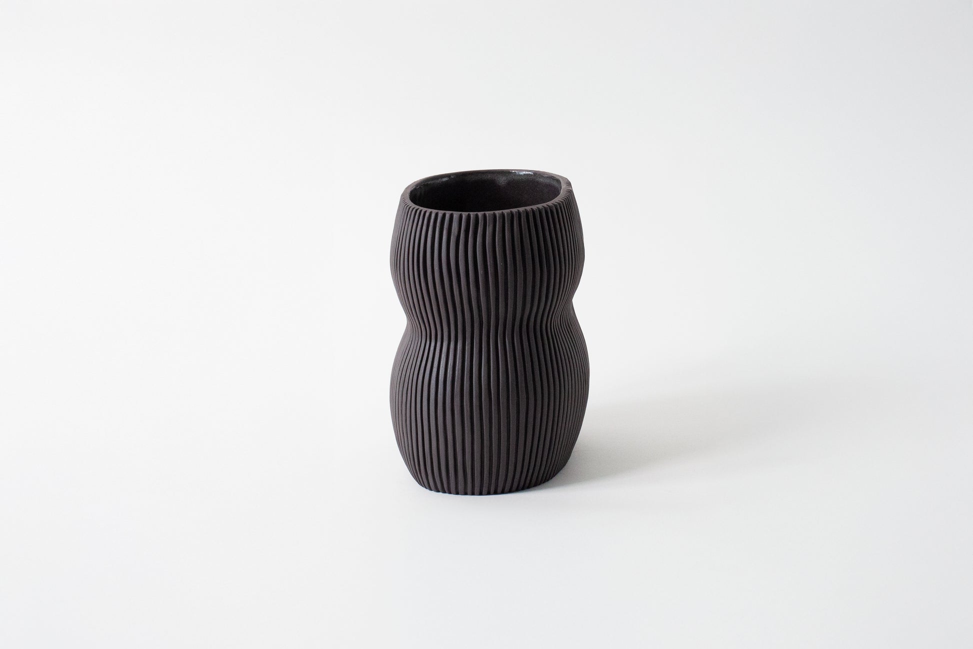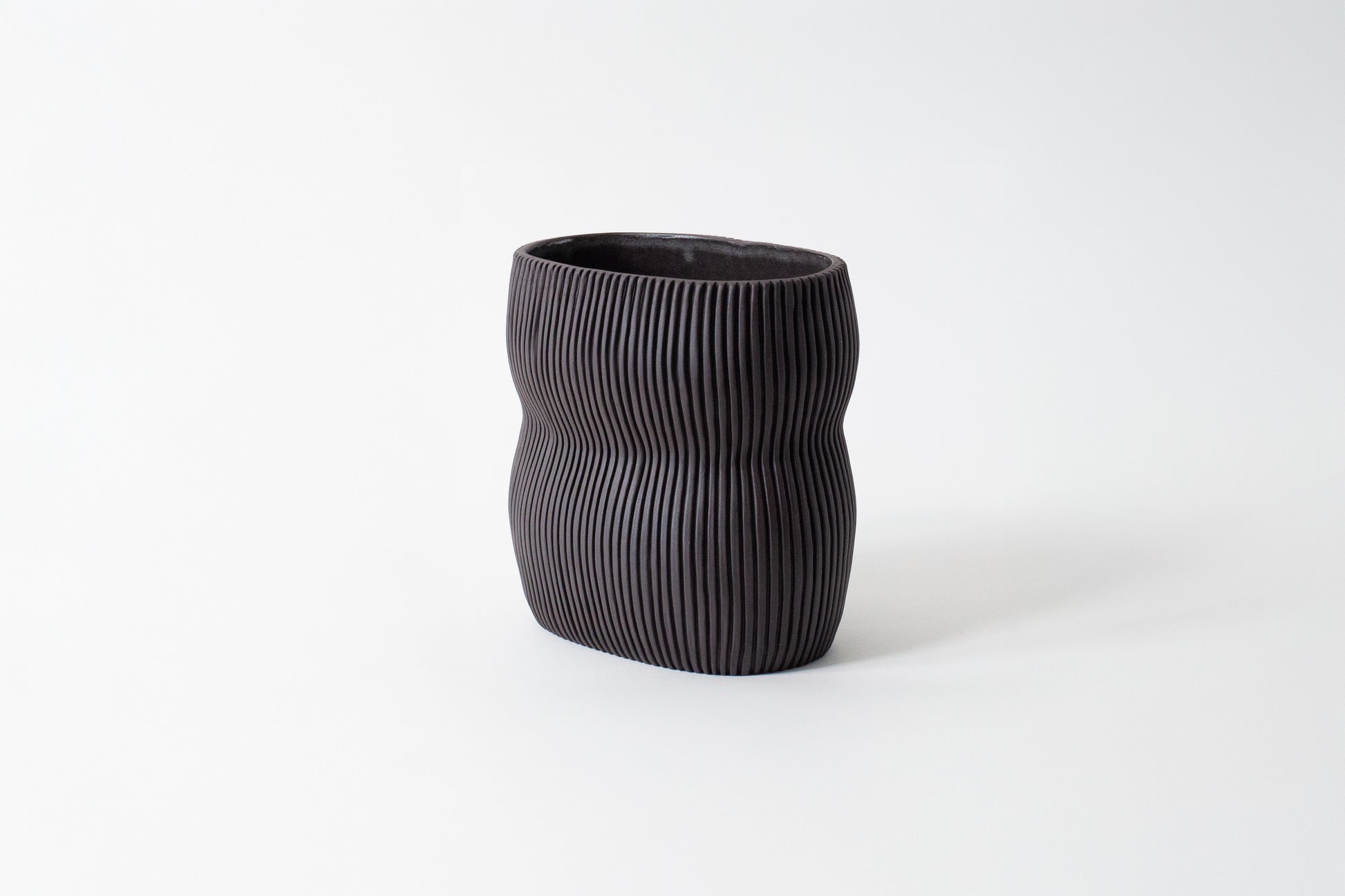 Unglazed black porcelain exterior with clear glazed interior. Each Oval Curvy Vase is hand-sculpted, hand-carved, and one-of-a-kind. The Oval Curvy 2.0 Collection offers thicker ribbing with more wabi-sabi.