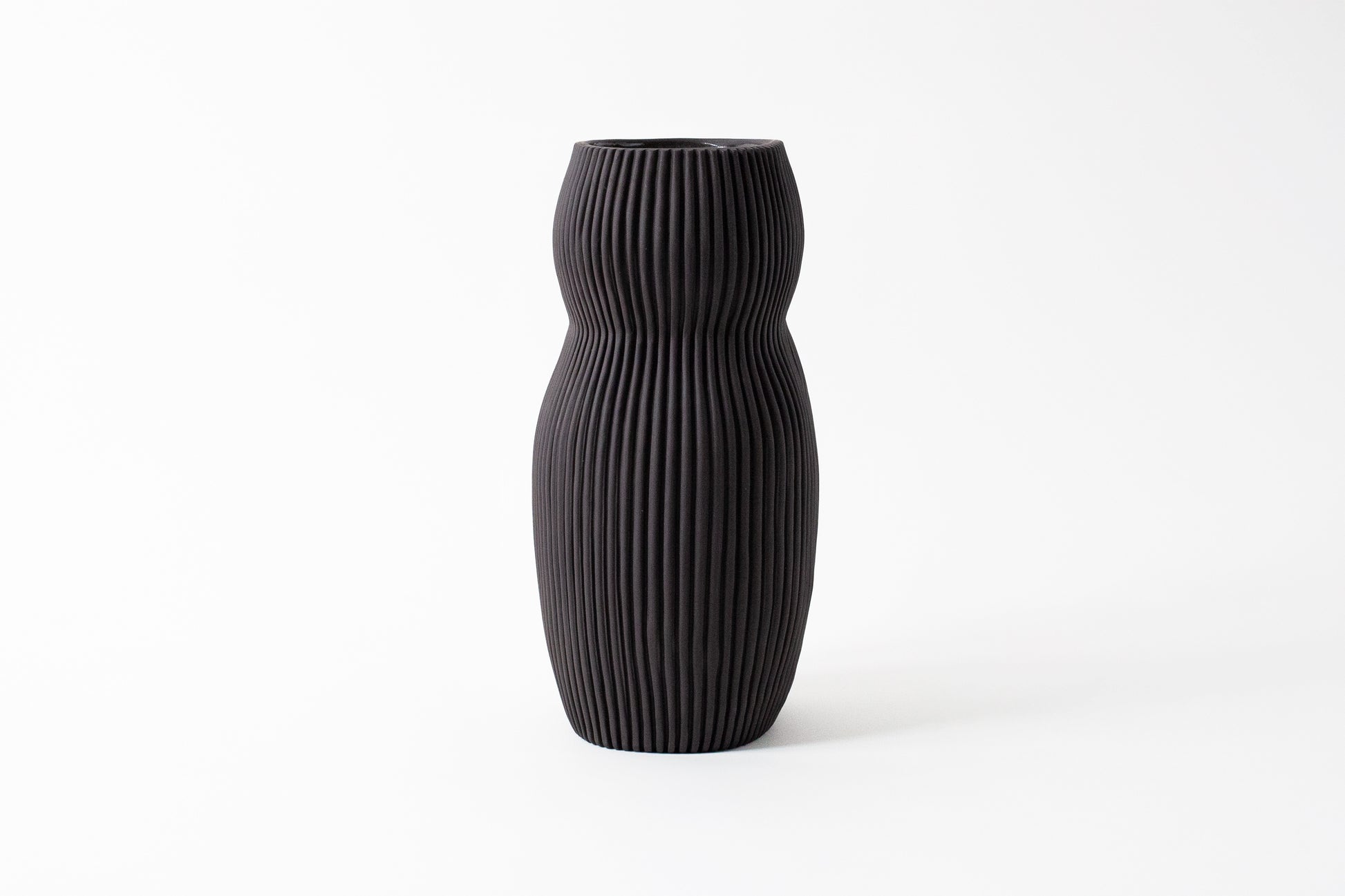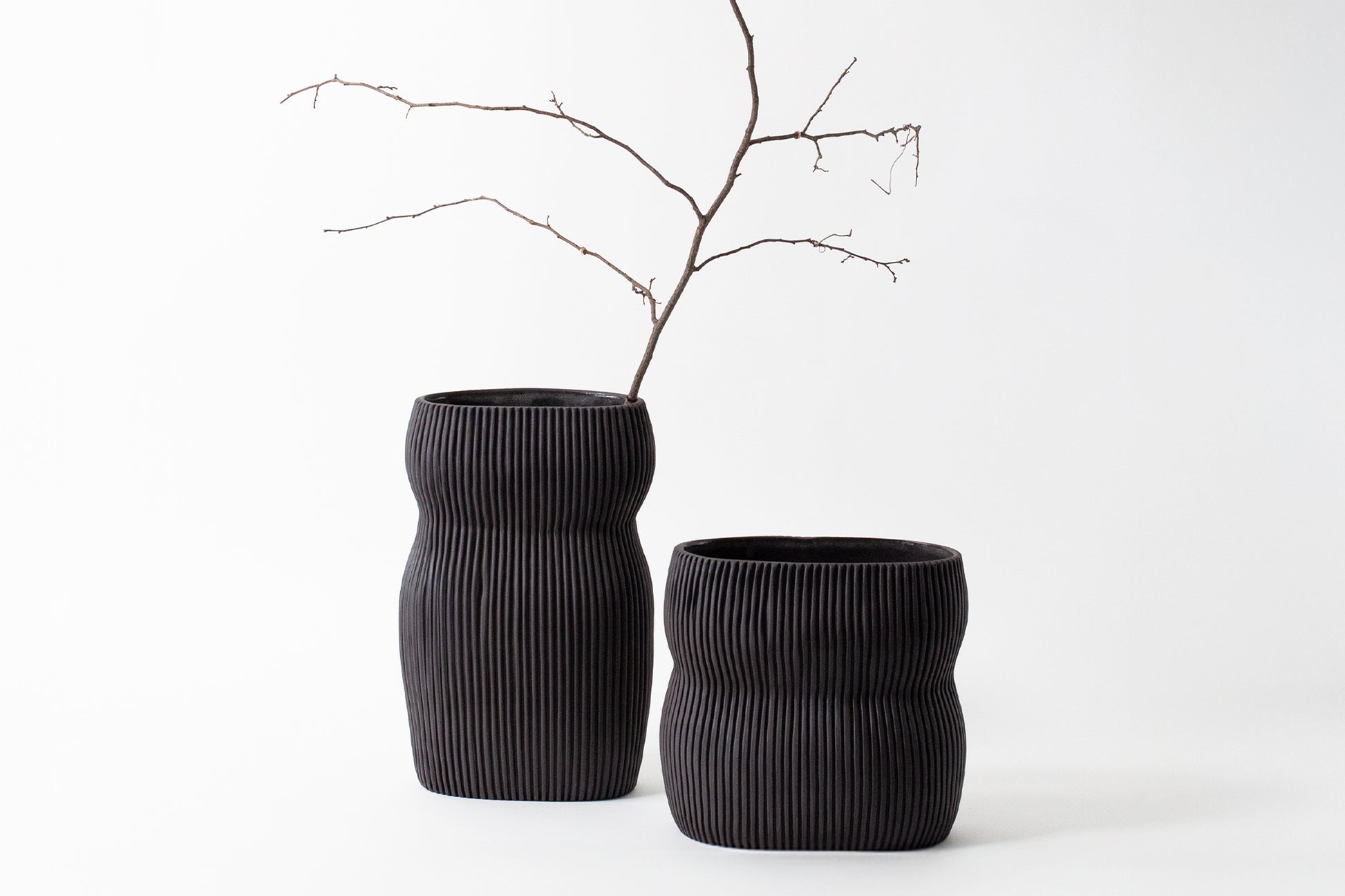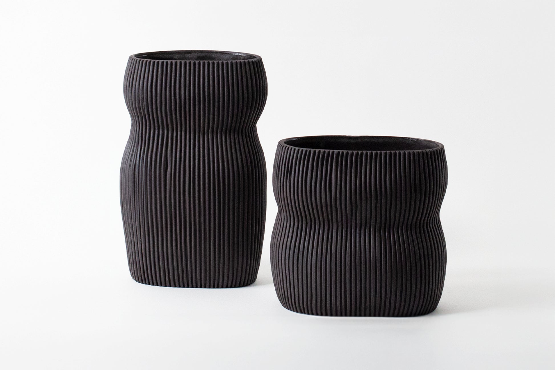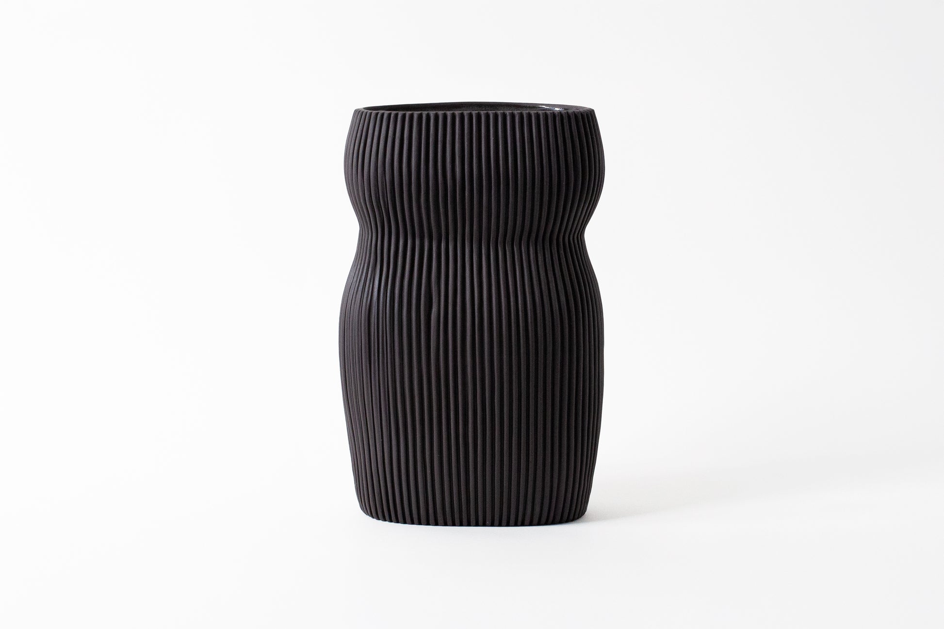 Unglazed black porcelain exterior with clear glazed interior. Each Oval Curvy Vase is hand-sculpted, hand-carved, and one-of-a-kind. The Oval Curvy 2.0 Collection offers thicker ribbing with more wabi-sabi.