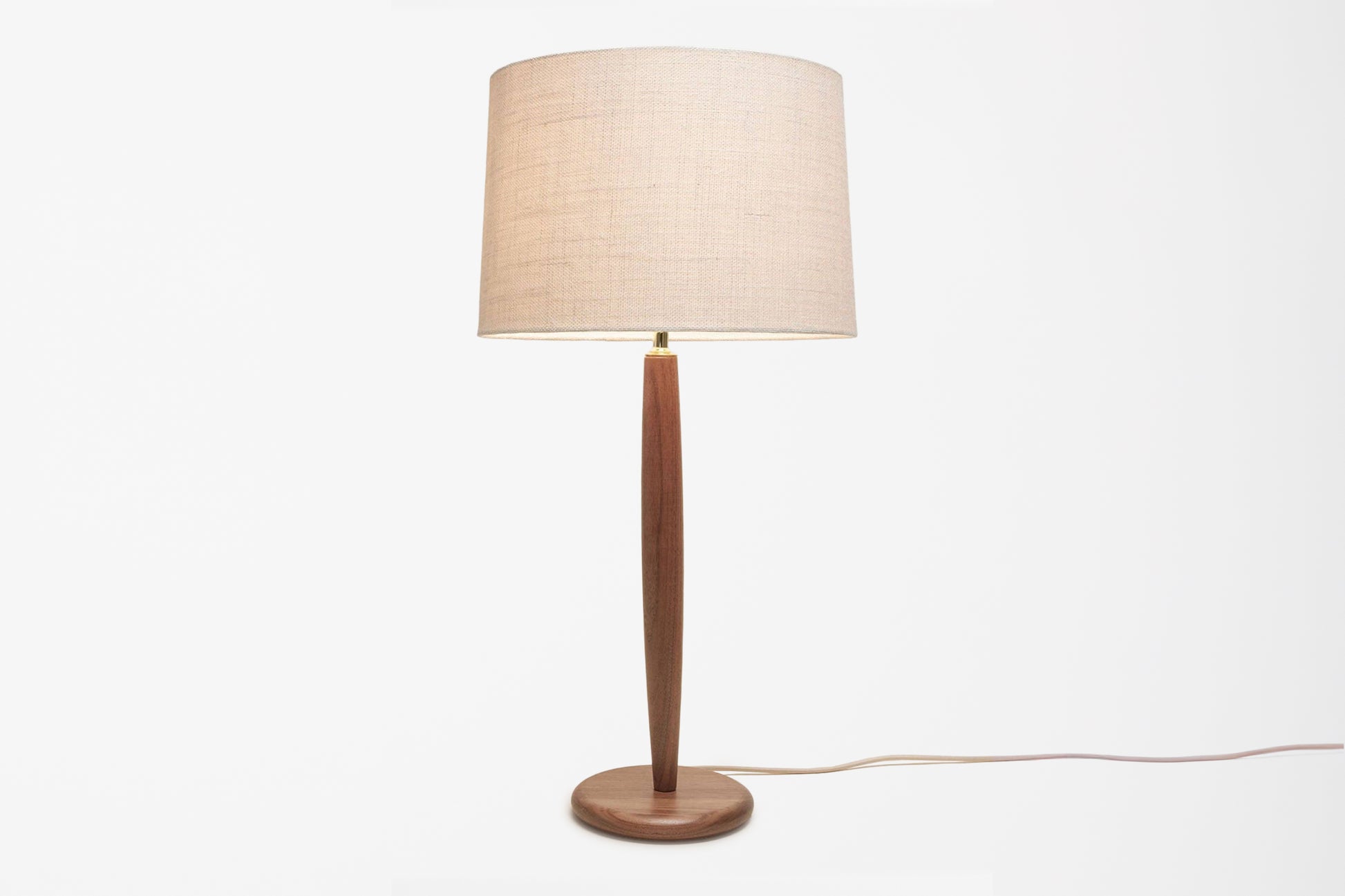 Inspired by the French Rolling Pin, this lathe-turned wooden lamp is a stunning addition to any room. Handcrafted in the US.