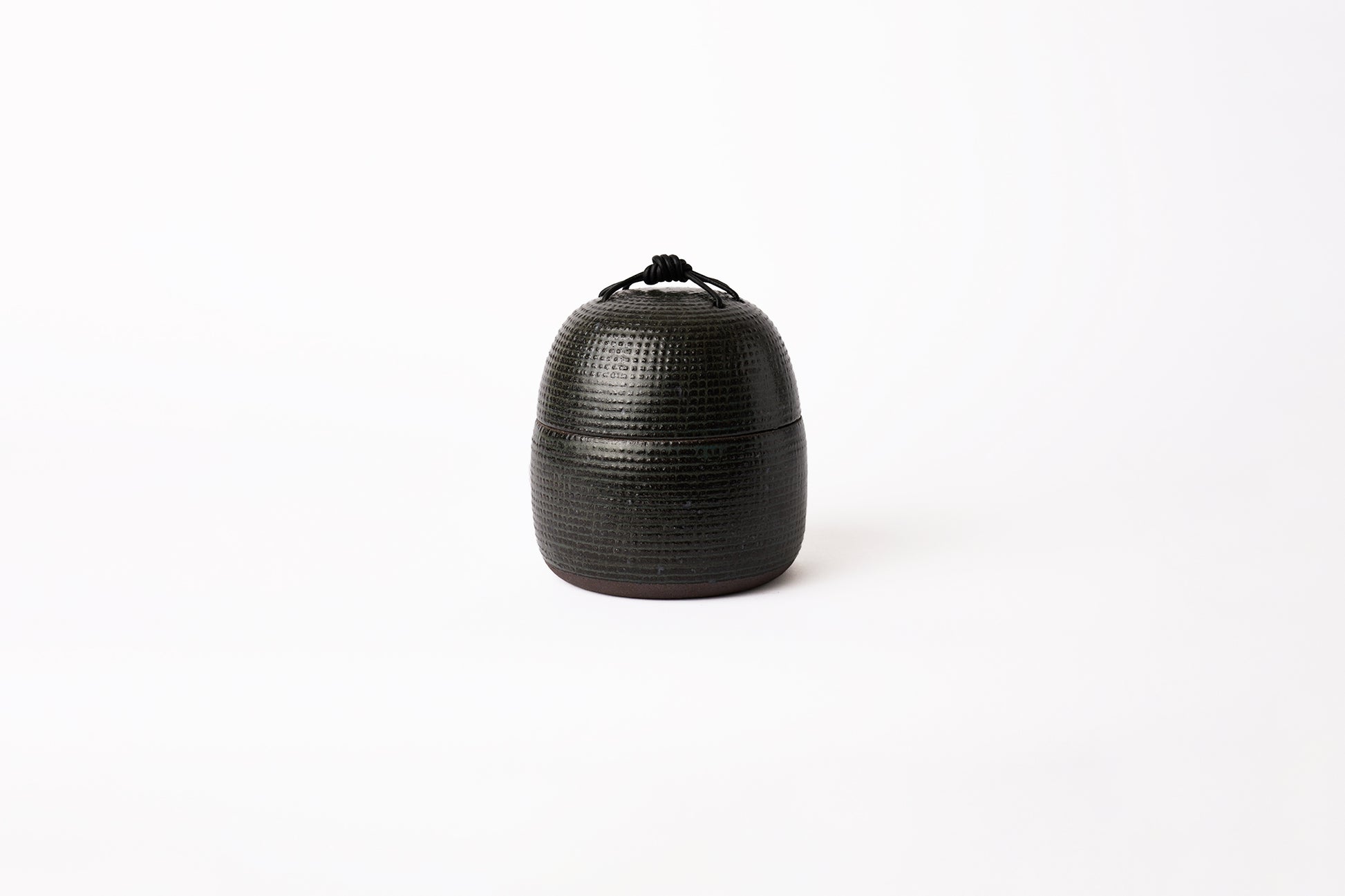Stoneware jar in a satin black glaze with brown leather handle. Handmade by Len Carella in San Fransisco.