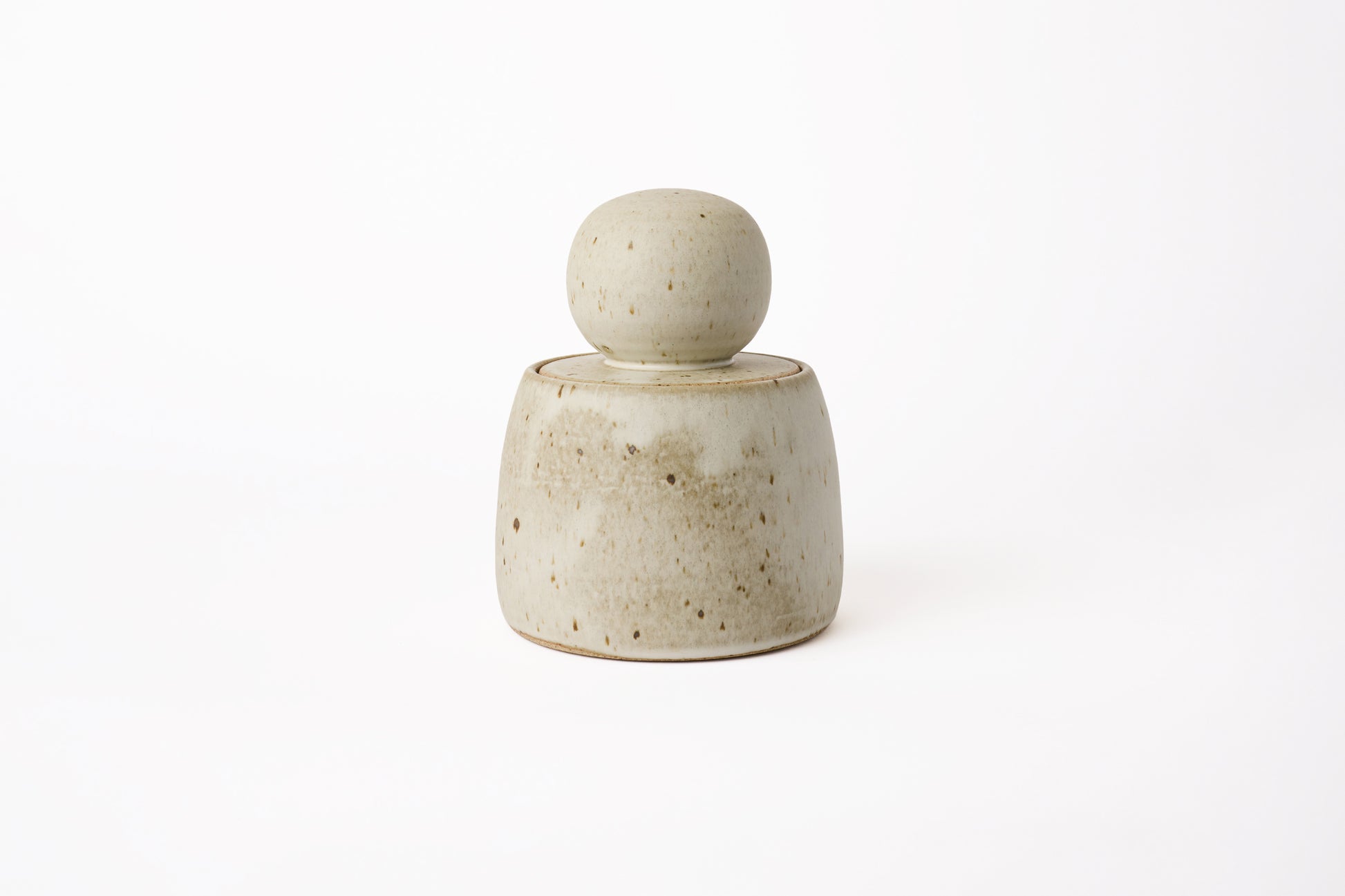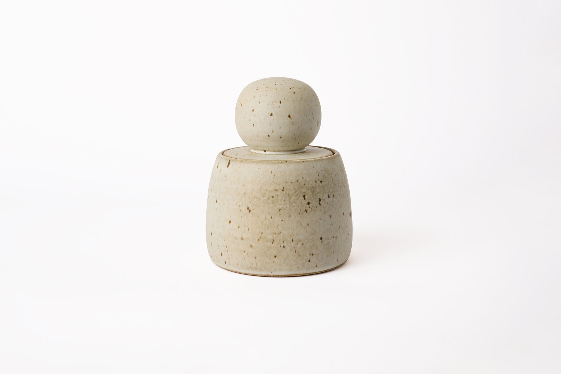 Ceramic jars accented with large chunky knobs and finished with a matte glaze in varying shades of cream and white. Handmade in Los Angeles.