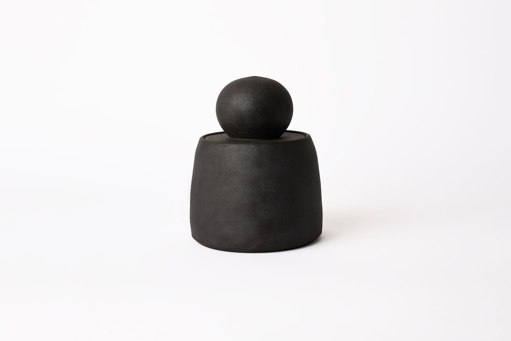 Ceramic jars accented with large chunky knobs and thrown from a chocolate brown stoneware. The matte black charcoal exterior highlights the natural texture of the clay while the interior of the jar is finished in a glossy black glaze.