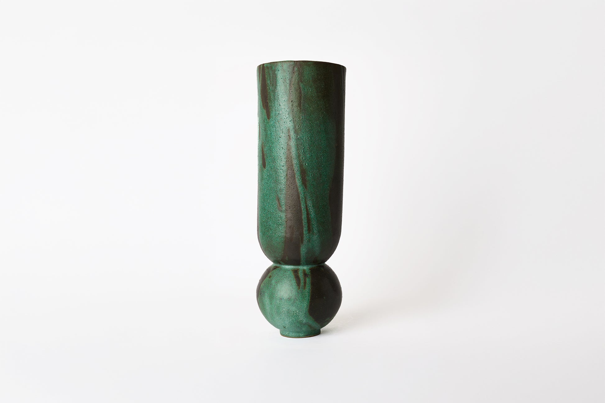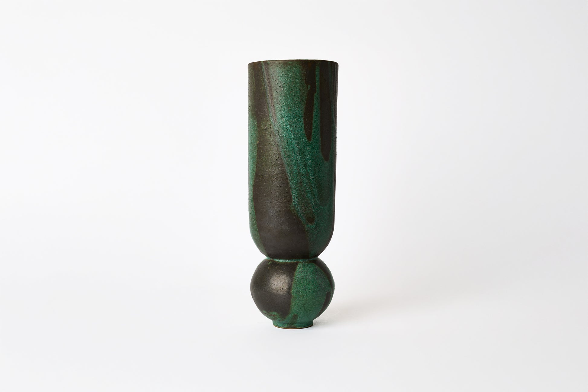 Stoneware vase with ball base in variegated green glaze. Handmade in Brooklyn, NY.