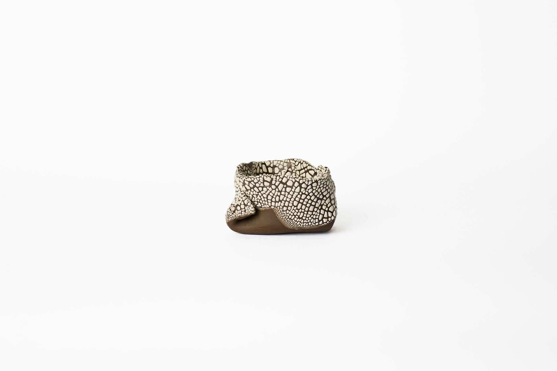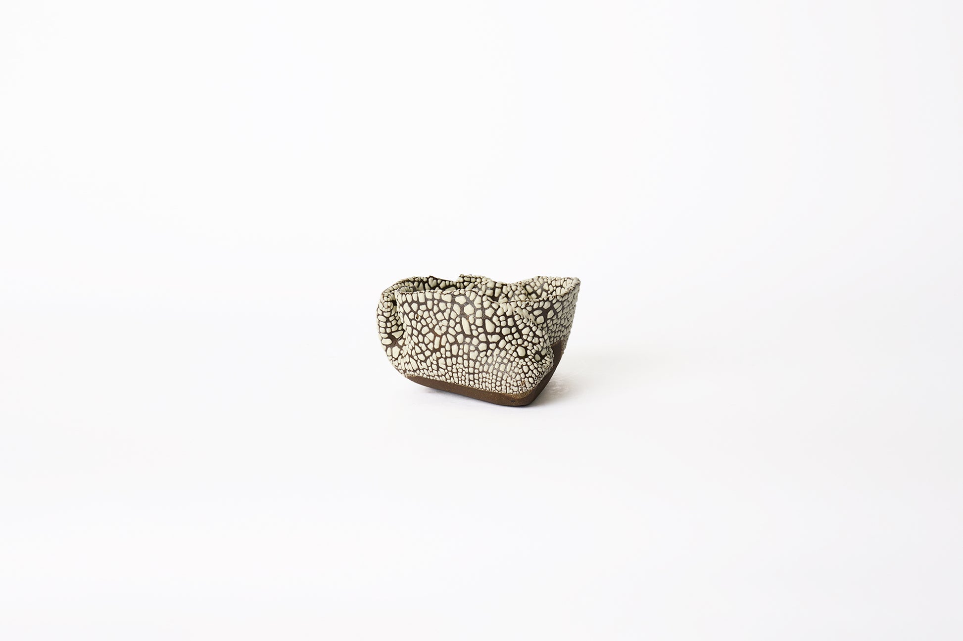 Hand built from a single slab of clay, these planters were folded and pressed into shape and glazed on the exterior with a crawling white glaze on dark brown clay body.