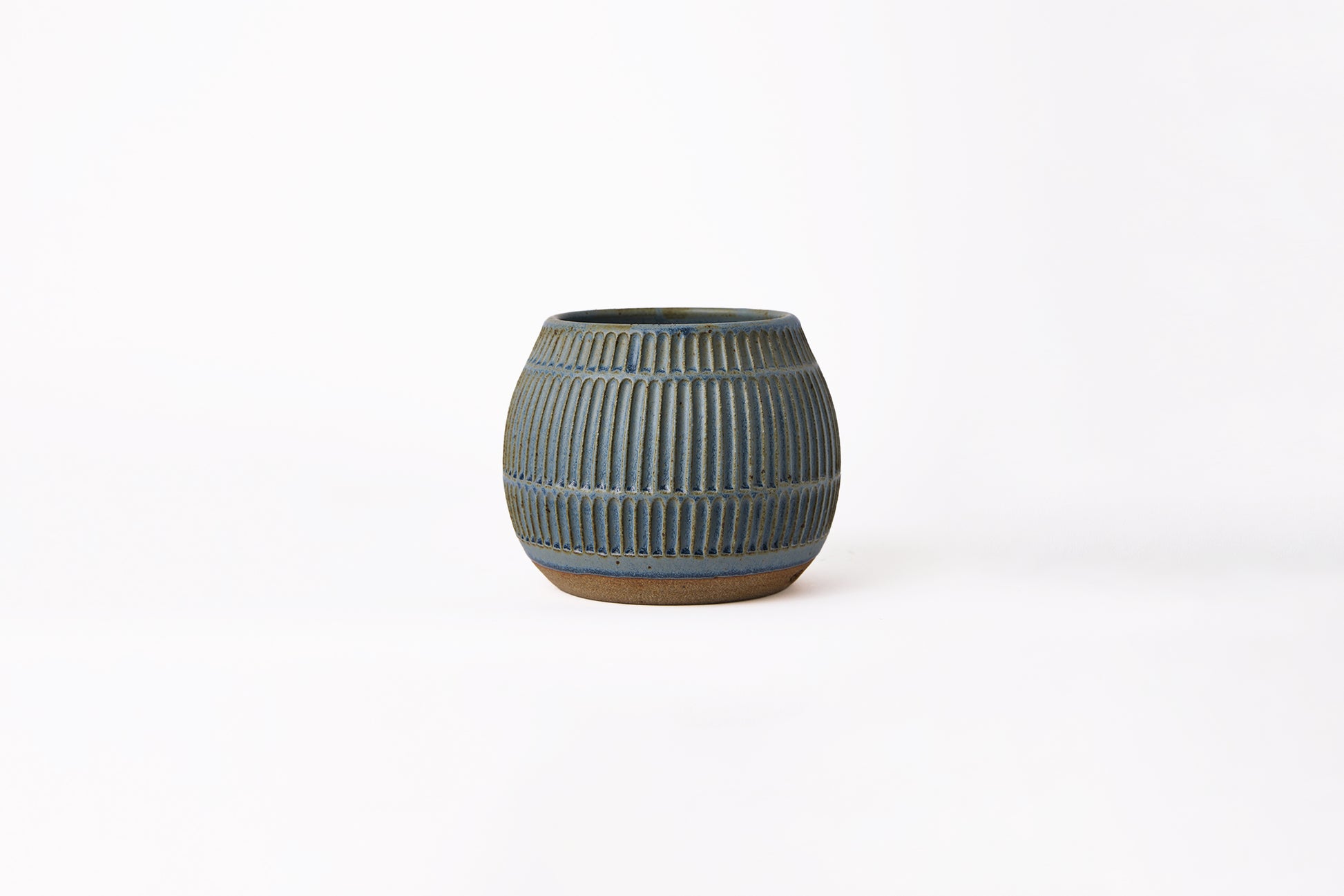 Stoneware planter in a brown-speckled white glaze featuring a Mt. Washington Pottery's signature hand-carved design. Made in Los Angeles.