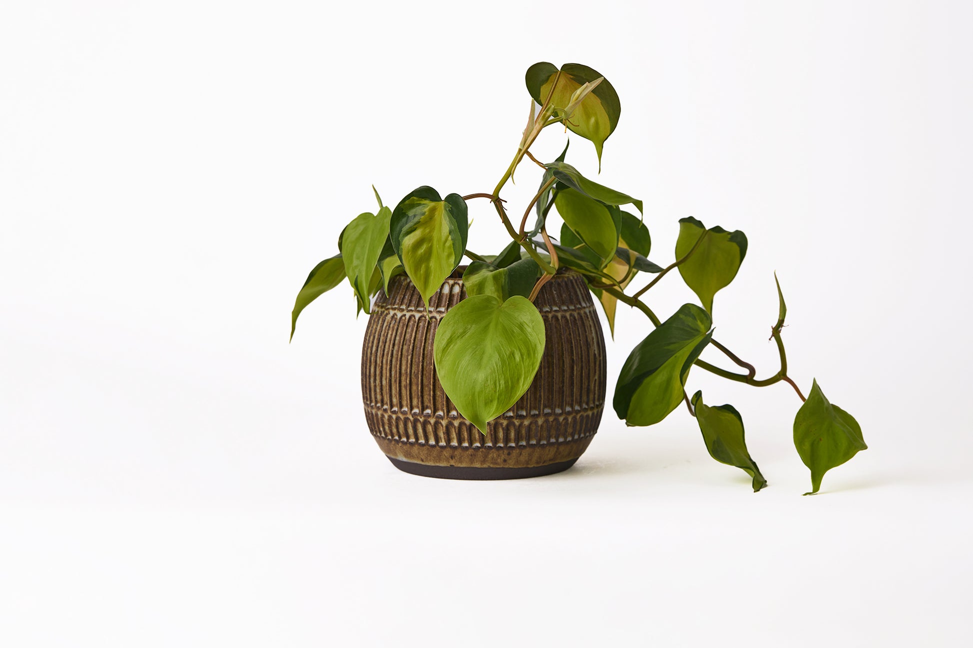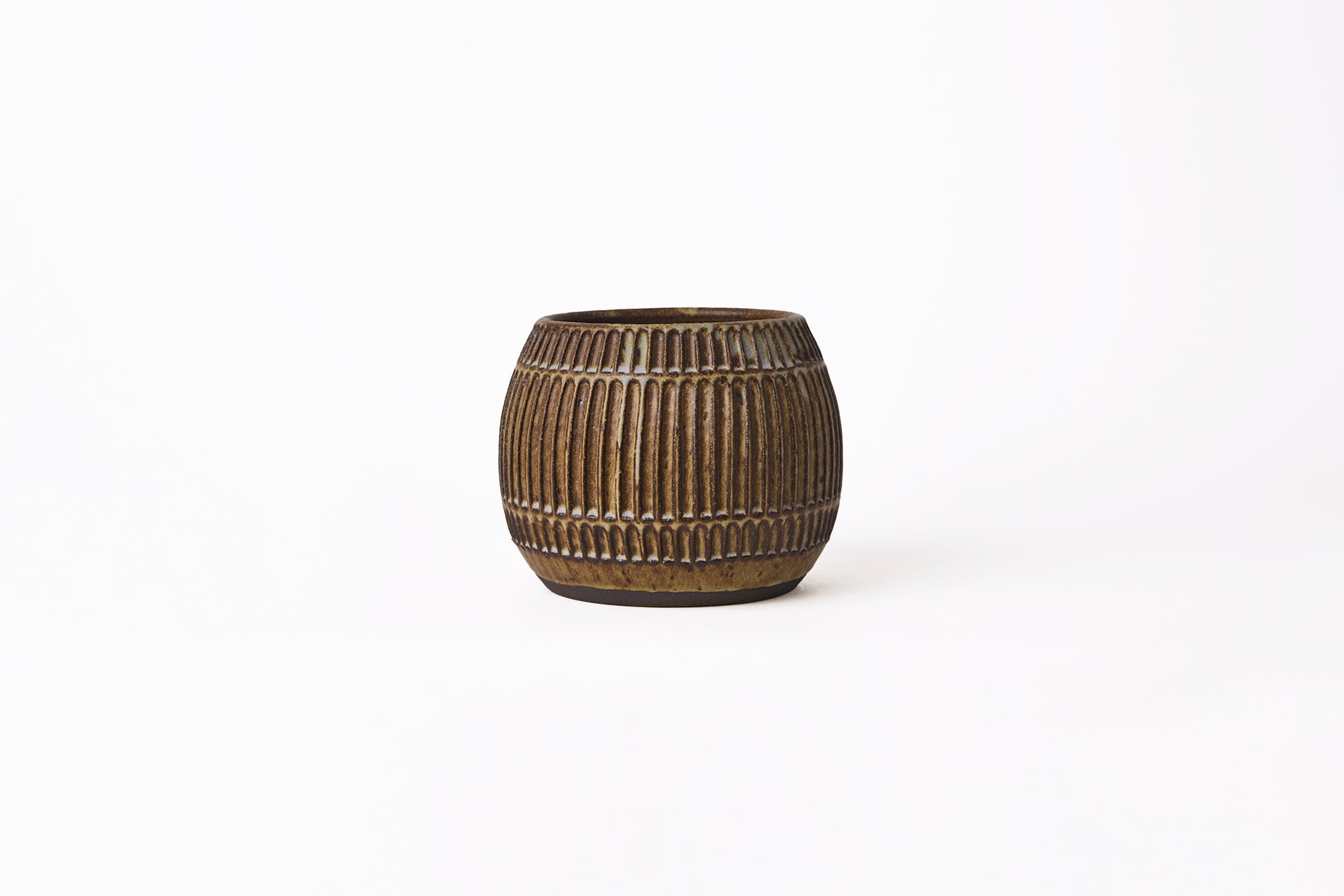 Stoneware planter in a dark lavender glaze featuring a Mt. Washington Pottery's signature hand-carved design. Made in Los Angeles.