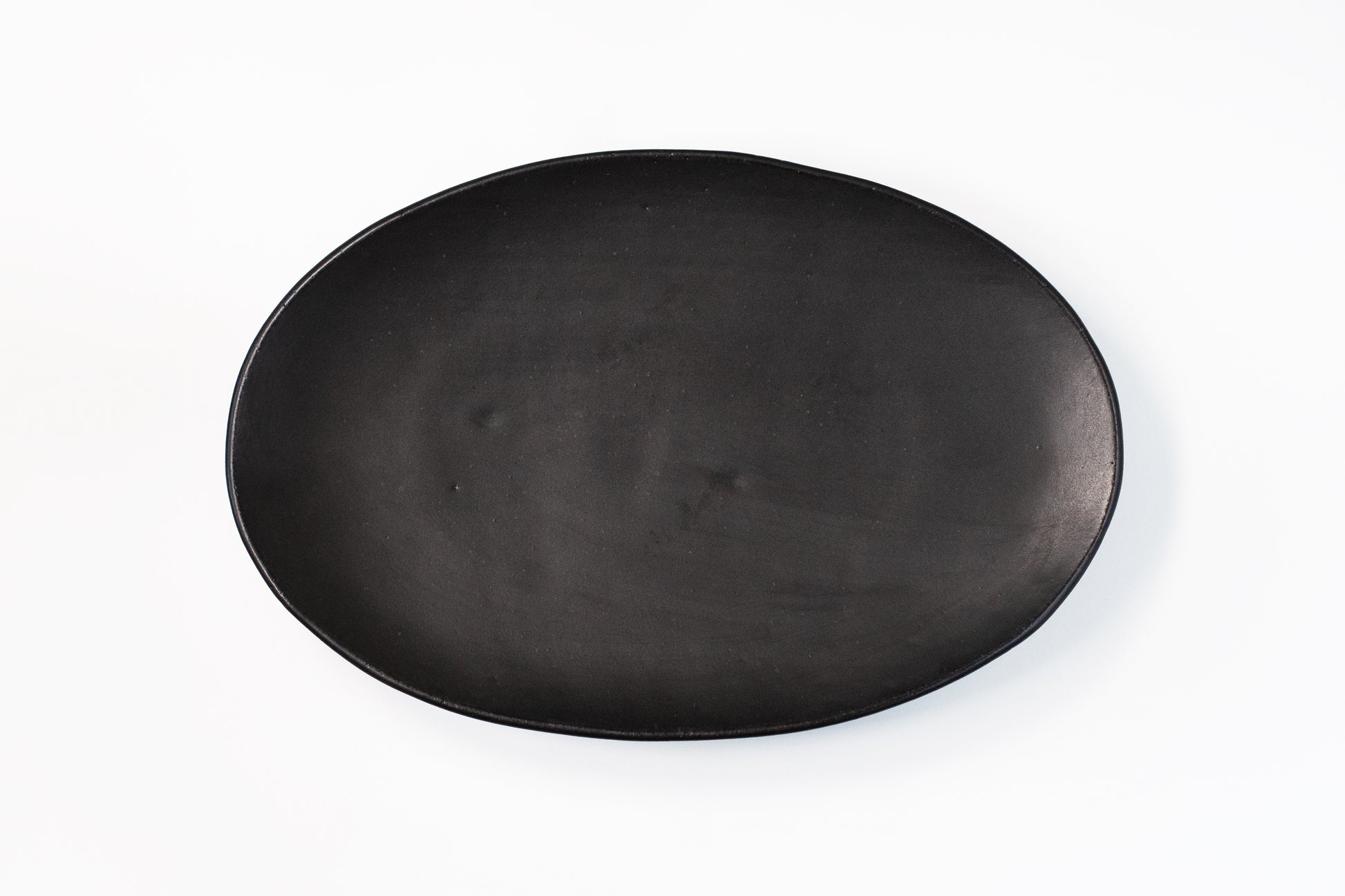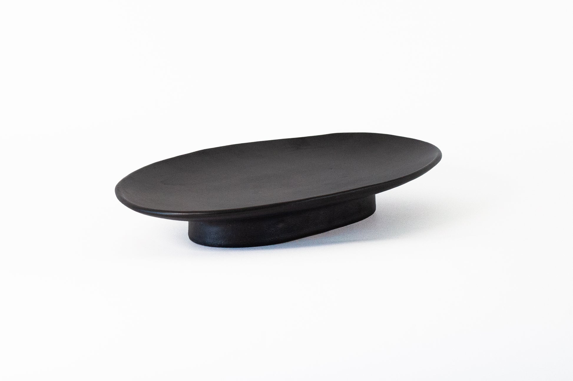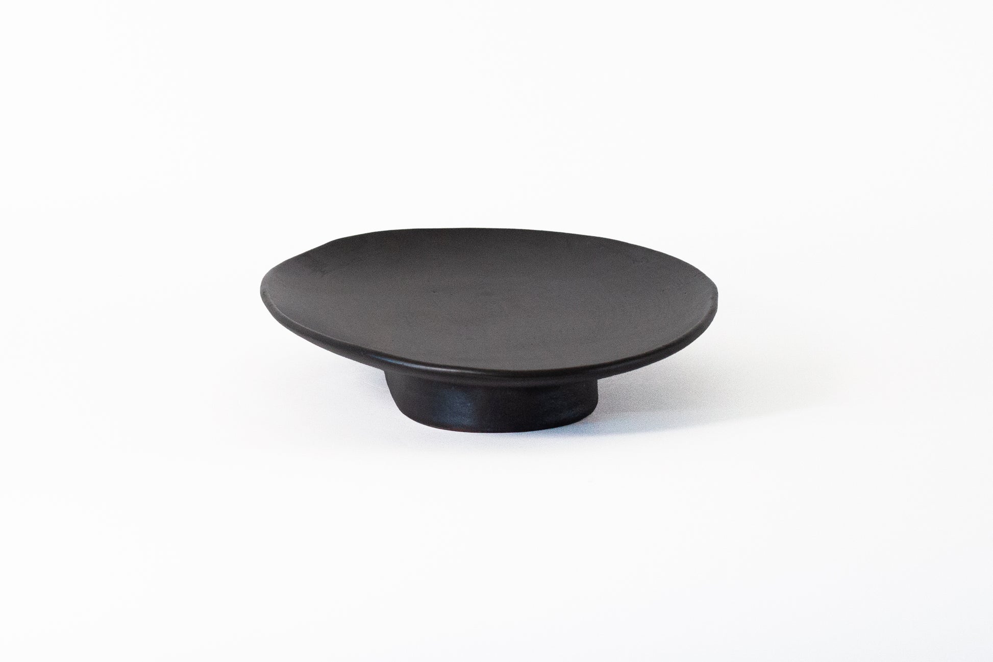 Stoneware platter with a low profile pedestal base in satin black glaze. Handmade in San Francisco.