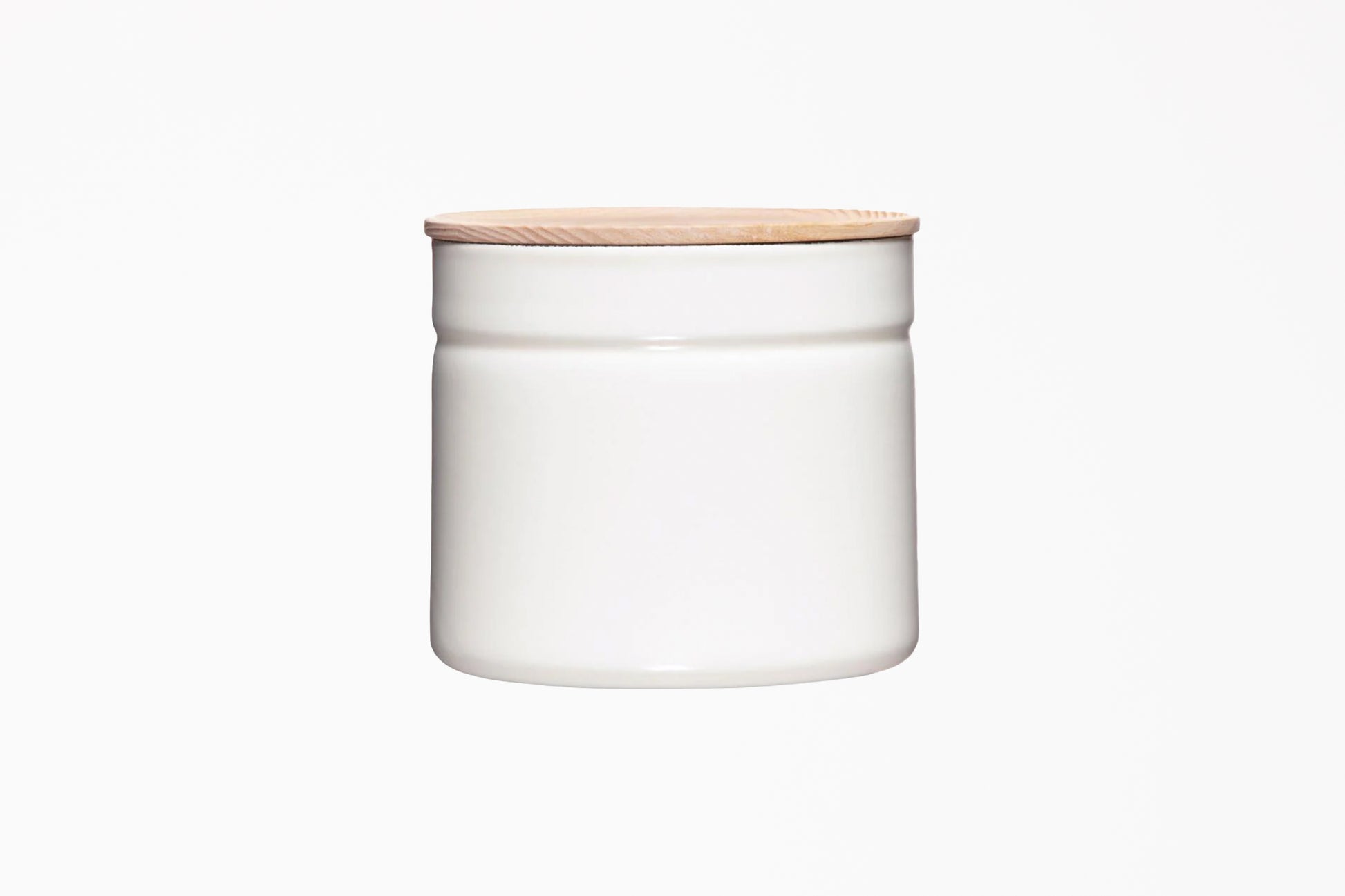 Enamel coated storage container with ash wood lid. Made in Austria.