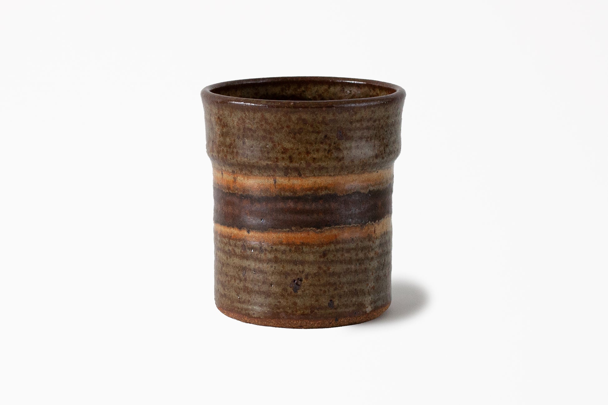 A vintage studio pottery crock with striped glaze in khaki, goldenrod, and maroon.