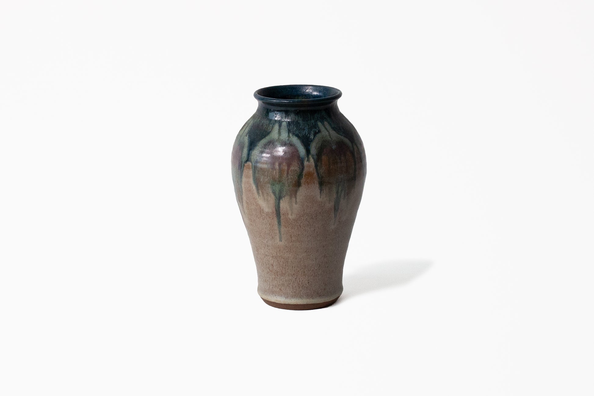A vintage studio pottery vase with drippy glaze variation in brown, tan, and blue.