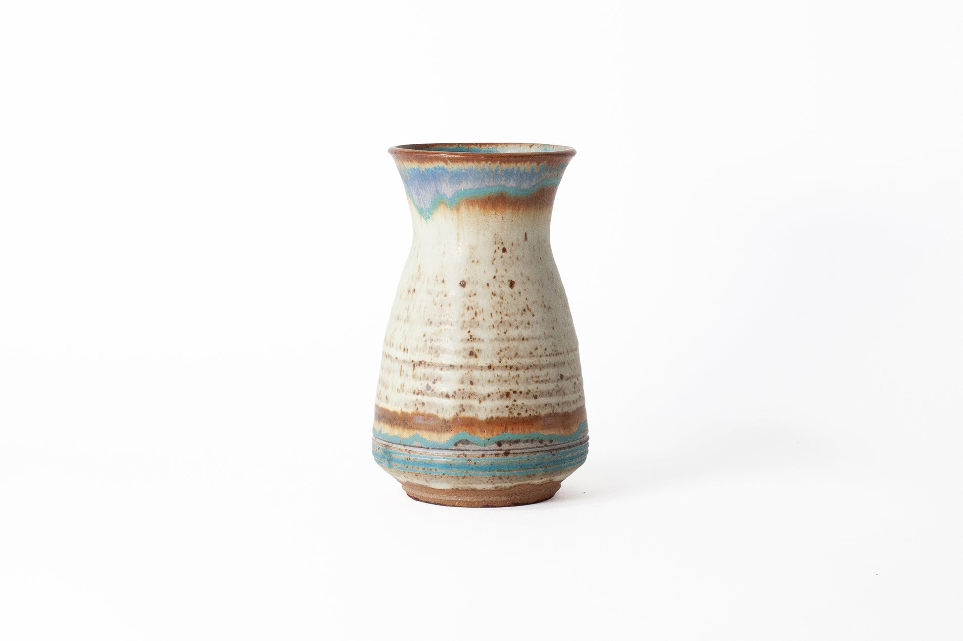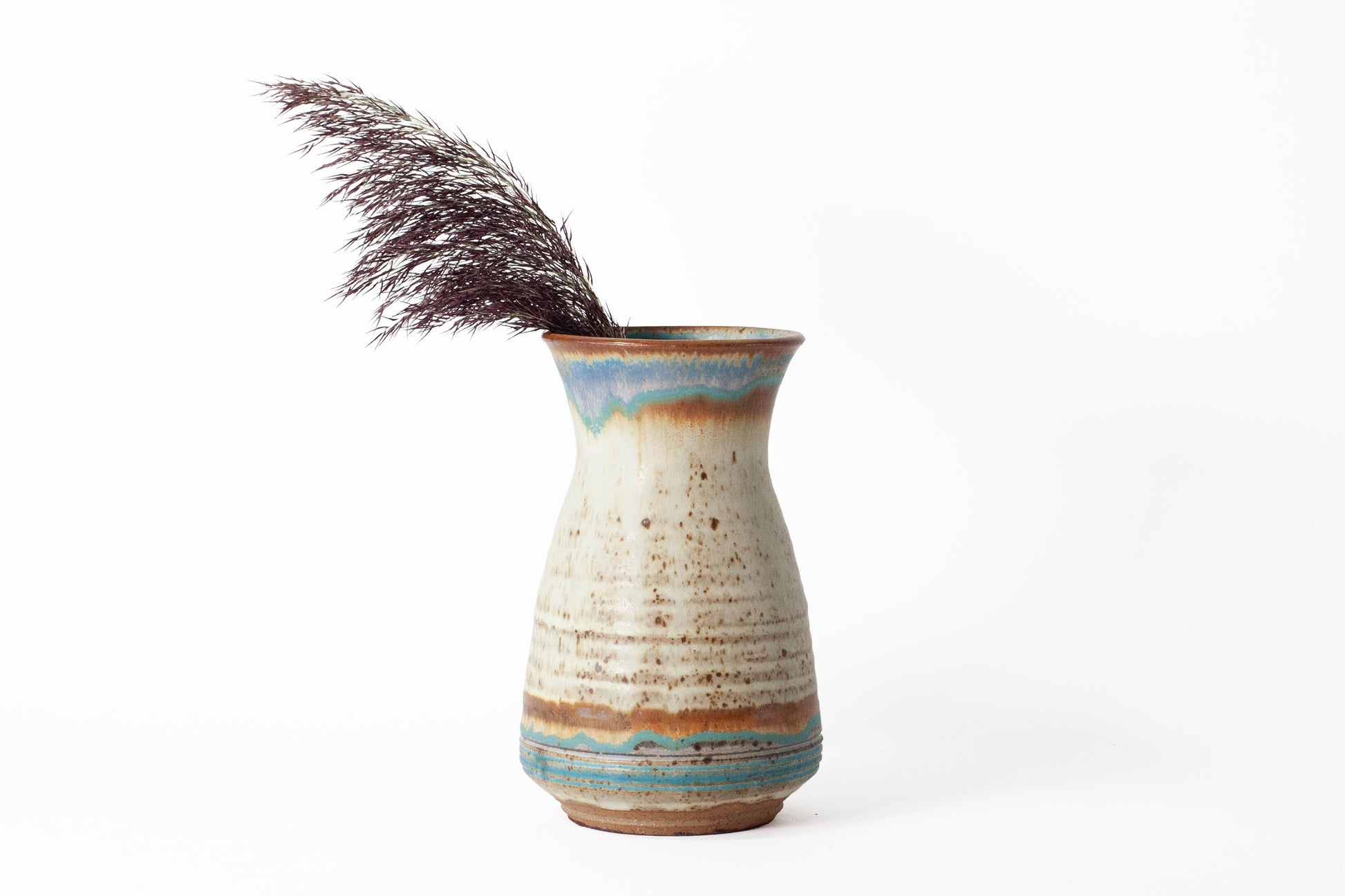A hand-thrown vintage studio pottery vase with a slightly flared mouth and speckled glaze variations in brown, tan, and blue.