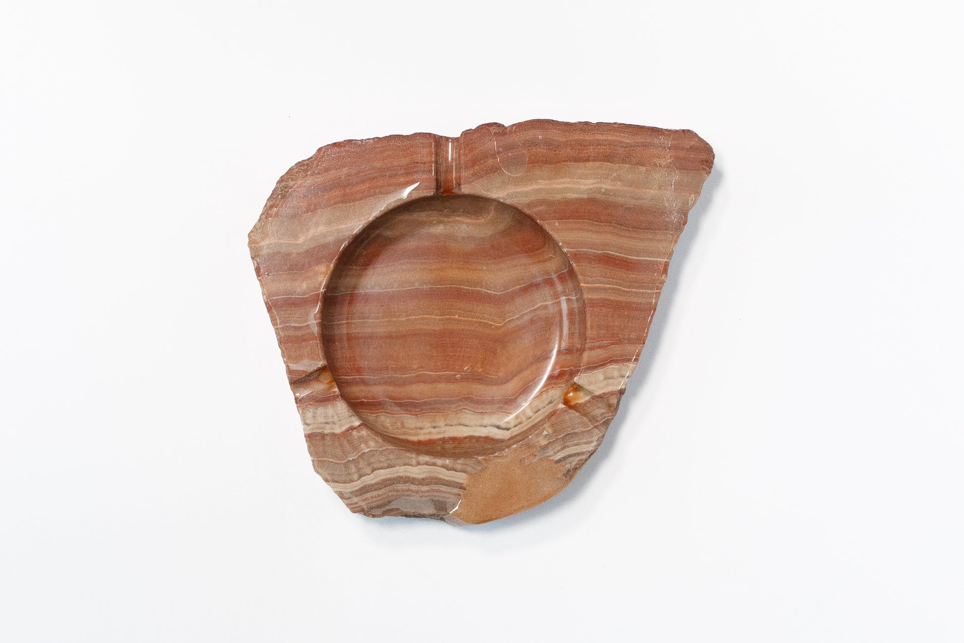 A vintage ashtray carved from a stratified brown, tan, and orange marble slab with a natural raw edge. It is perfectly functional for use or display.