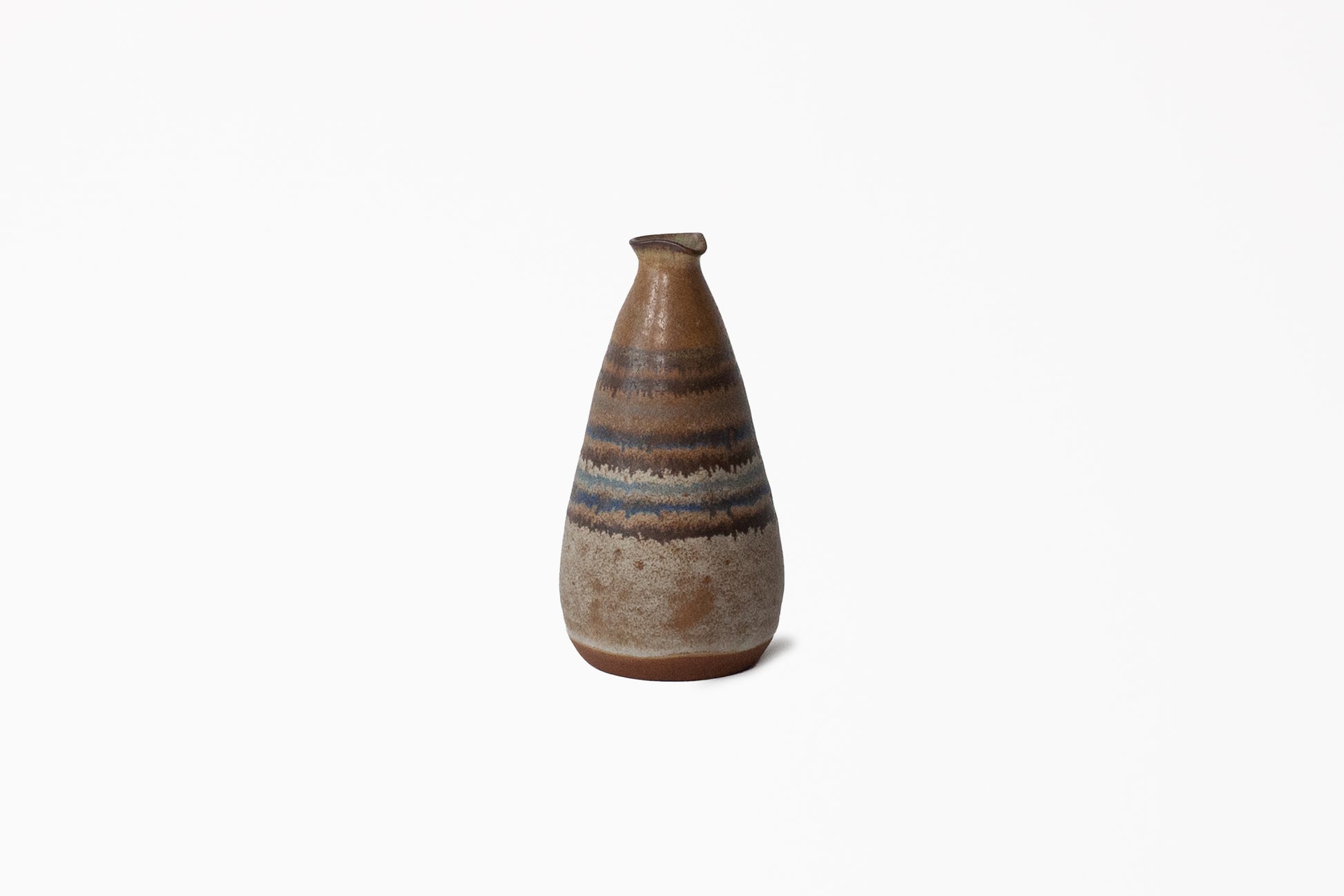 A vintage studio pottery carafe made by Kamini featuring a small flared mouth and pour spout with stratified glazes in blue, brown, orange, and tan.