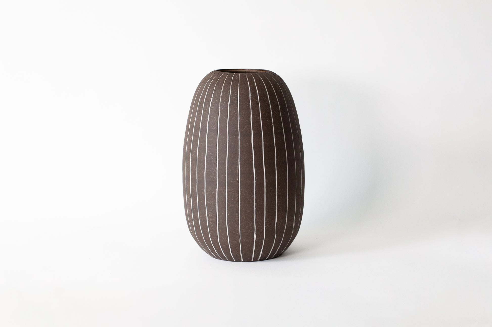 Hand-thrown, hand-etched dark stoneware. White Mishma glaze technique. Fill with flowers or top with a single tangerine. Made in Red Hook, NY.