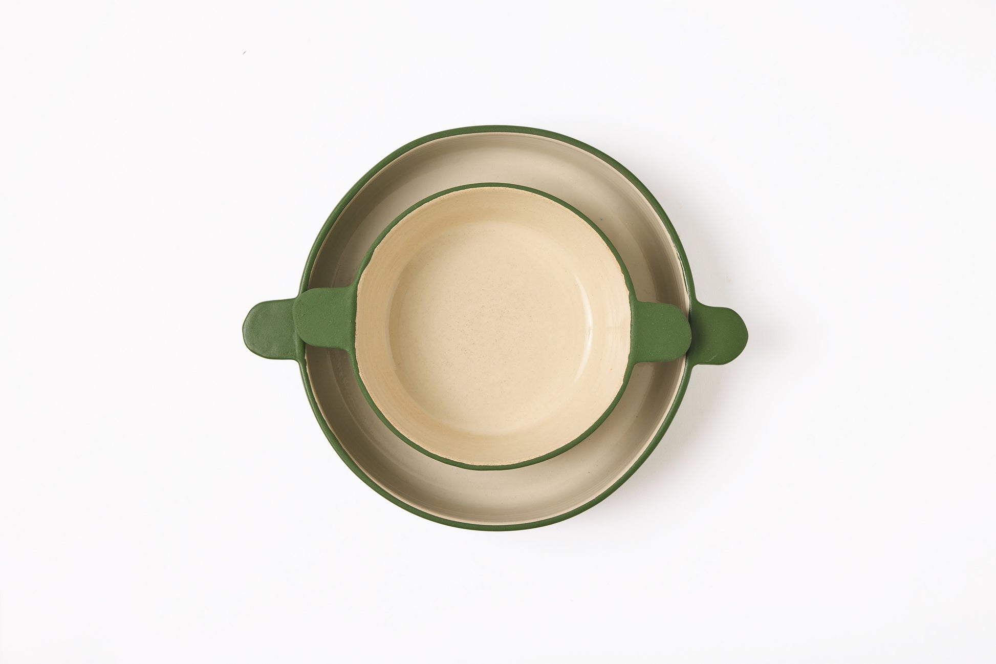 Hand thrown and built stoneware casserole dish with matte green glaze exterior and gloss clear interior finish.