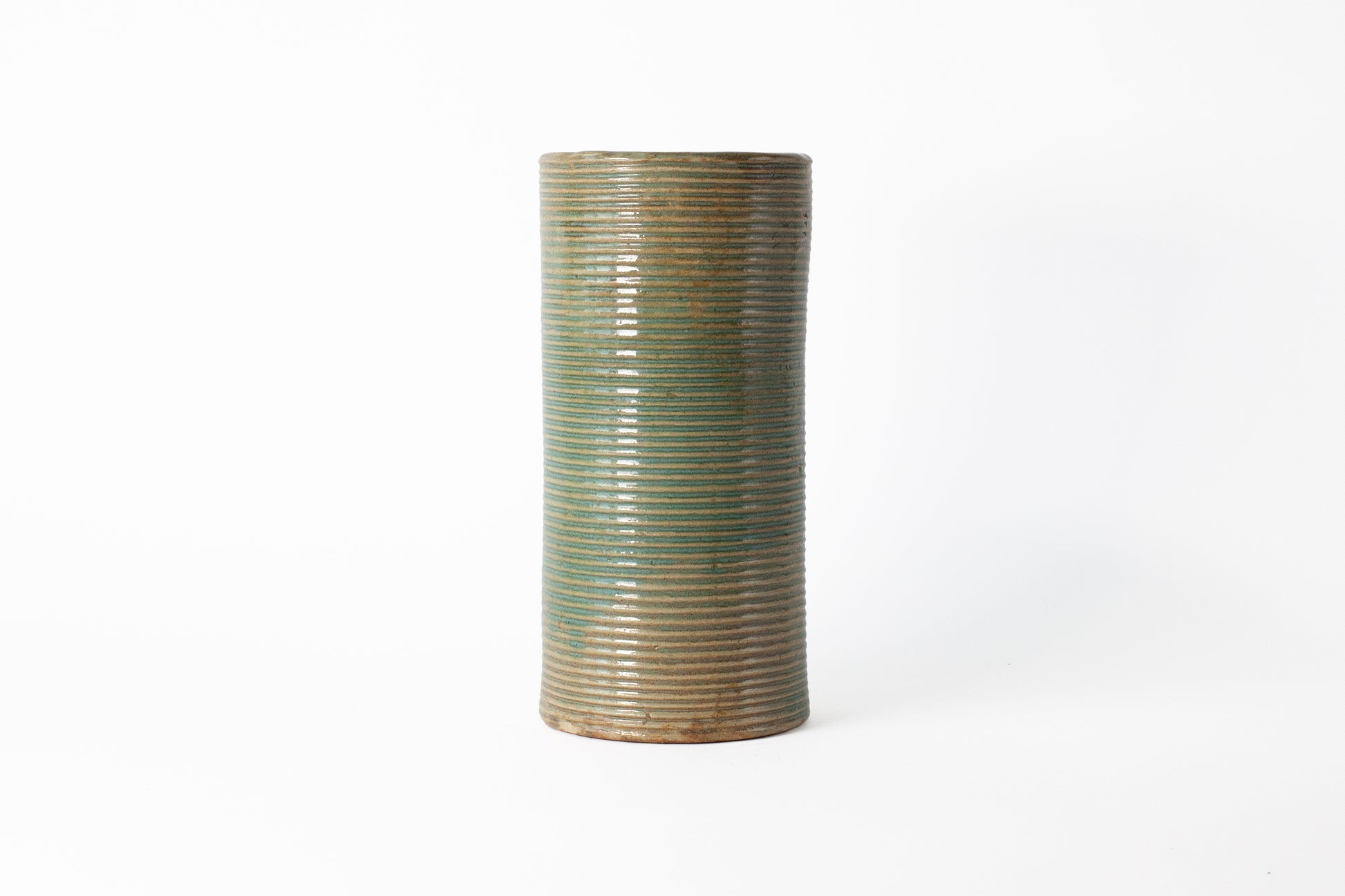 A midcentury Zanesville Stoneware Company vase from their Homespun Collection in a glossy tan/green glaze.